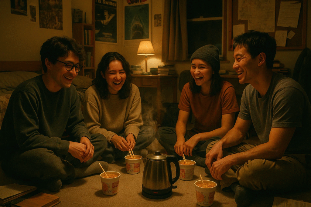 At midnight when we were starving after studying or gossiping everybody would get together in one room.I wonder Somebody would come with ramen cups, another one would find some disposable spoons, and we would sit on the floor with our legs crossed, slurping and laughing about nothing. It was a simple time,