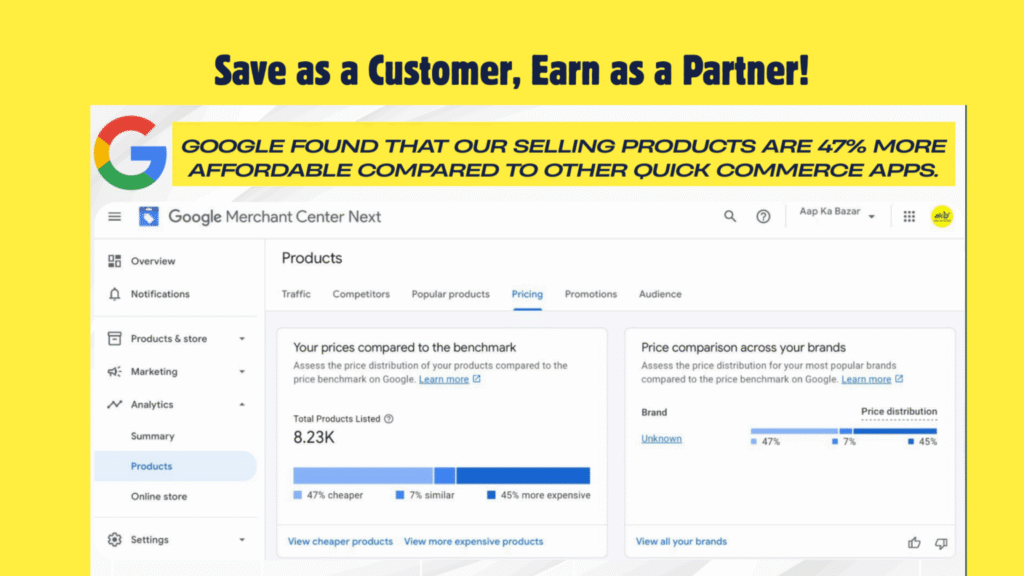 Google के आँकड़ों के अनुसार, Aap Ka Bazar के लगभग 47% प्रोडक्ट्स दूसरे ऐप्स से सस्ते हैं, जिसे आप दी गई इमेज में साफ़ देख सकते हैं।