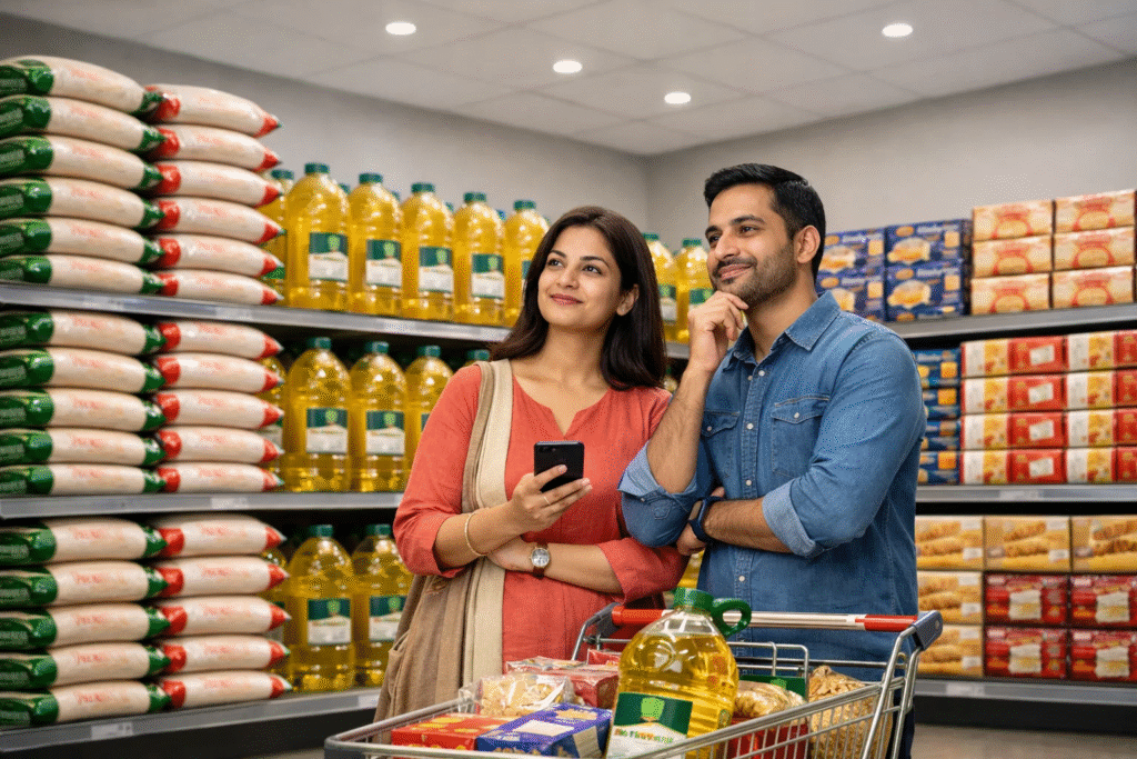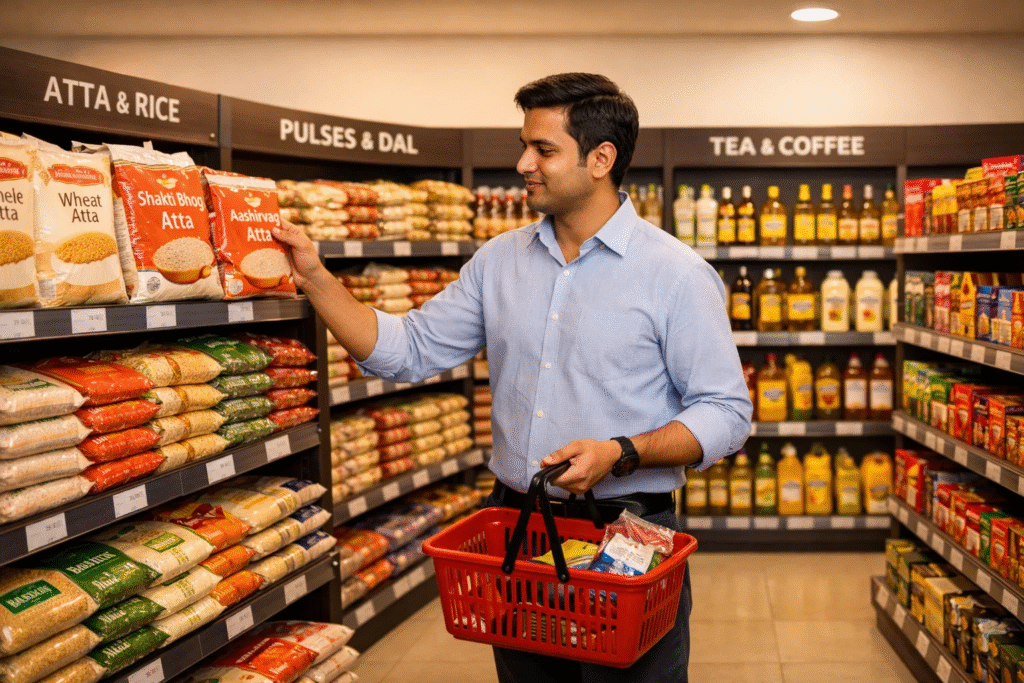 atta, rice, basmati rice, dals, rajma, chana, cooking oils, ghee, spices, masalas, tea, coffee, sugar, salt, snacks, biscuits, breakfast cereals, noodles, pasta, sauces, namkeen, chocolates, dry