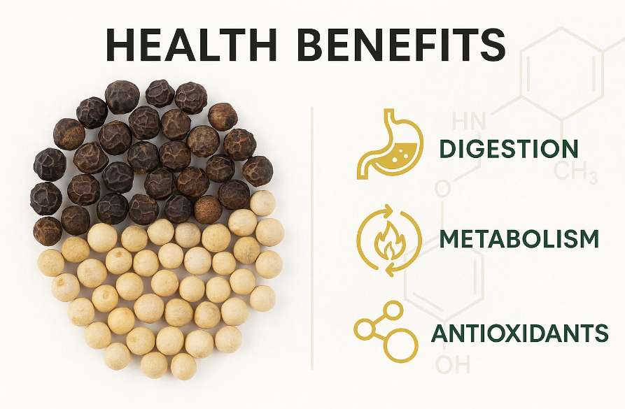 Pepper is a common seasoning that is often a subject of questioning among the cooks; Sometimes they ask themselves why black pepper is always used, while at other times, white pepper is the choice. Both belong to the same plant – Piper nigrum—but their processing and flavor profiles separate them remarkably. Besides, both peppers have their own health benefits that are hard to believe, mainly in digestion, immunity, and metabolism.
