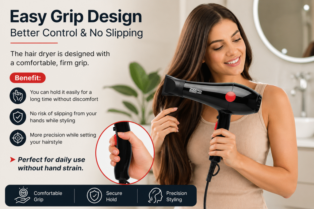 The hair dryer is designed with a comfortable, firm grip.