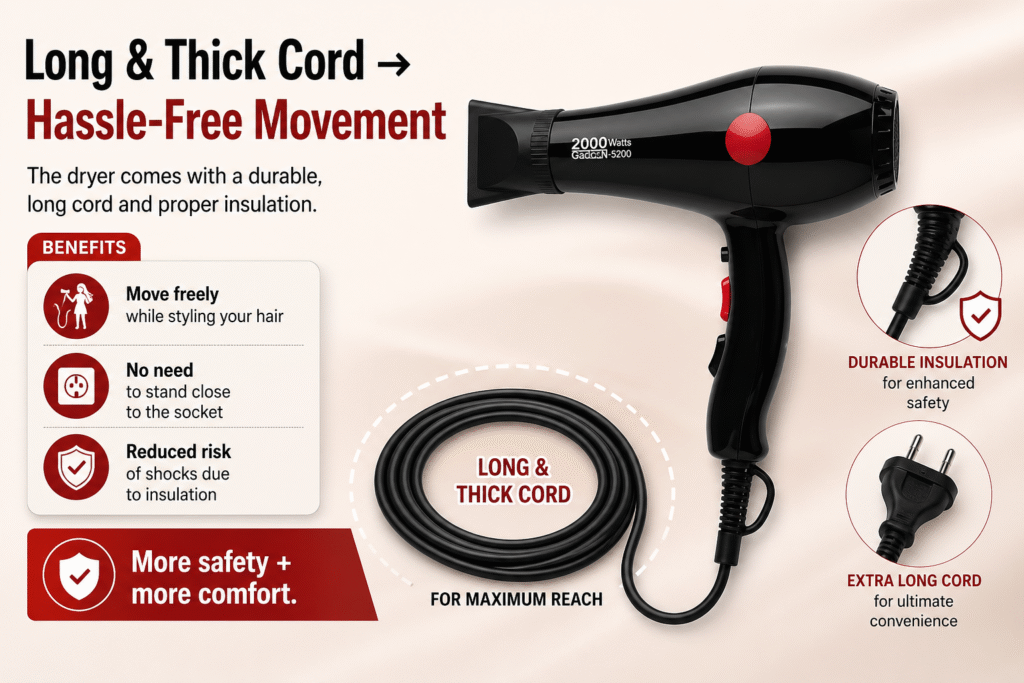 The dryer comes with a durable, long cord and proper insulation.