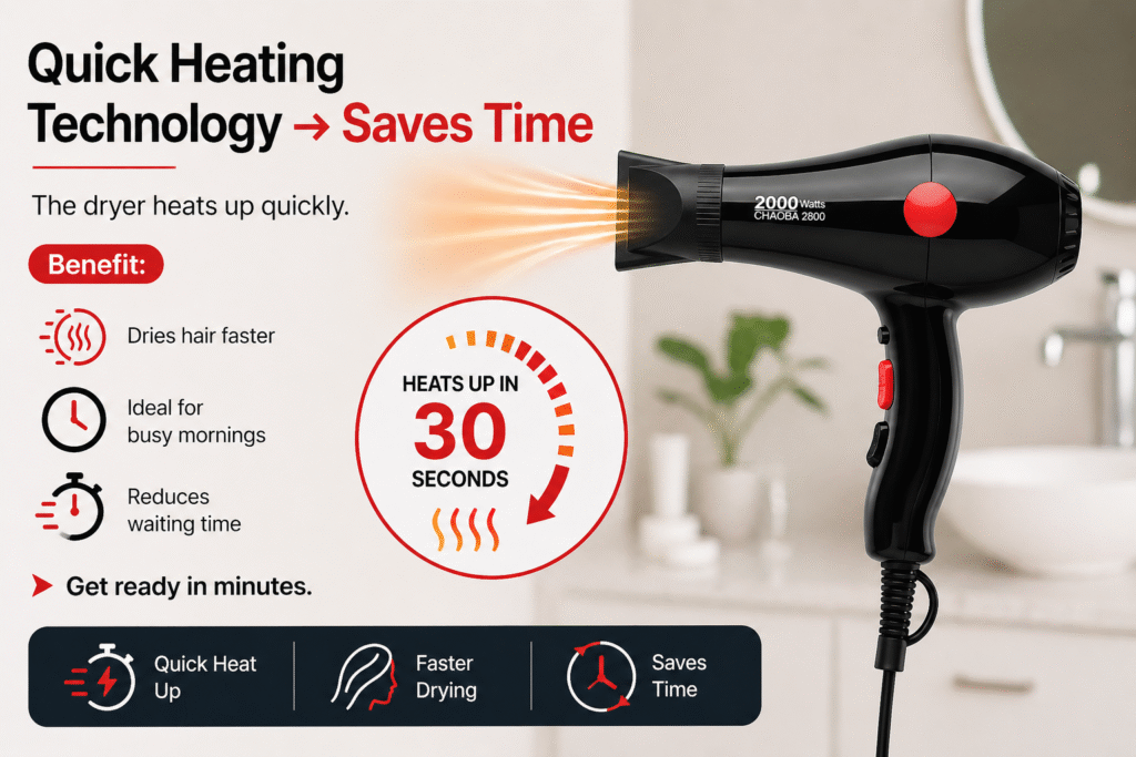The Chaoba 2800 Hair Dryer is not just about specs—it’s about how those features actually help you in daily life. Here’s a clear breakdown of feature → benefit so you know exactly what you’re getting.