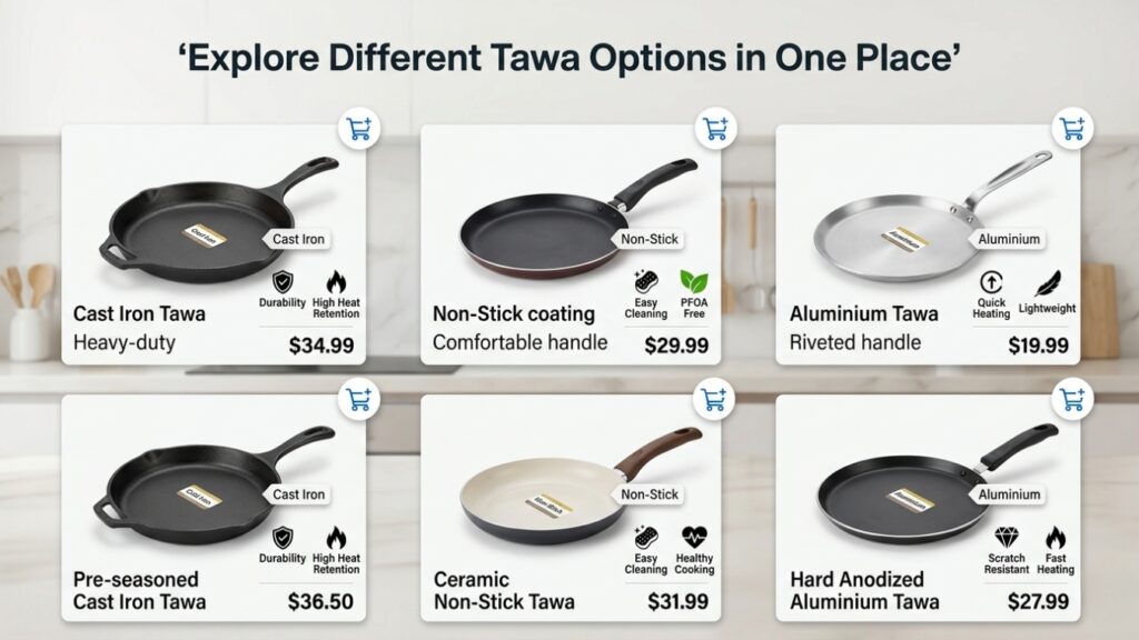 You can compare the different kinds of tawas available, be it cast iron, non-stick, or aluminium.