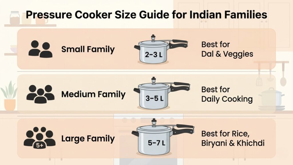 Indian families often recommend that you have a smaller capacity cooker for making dal or veggies and a bigger-capacity cooker for making rice or khichdi.