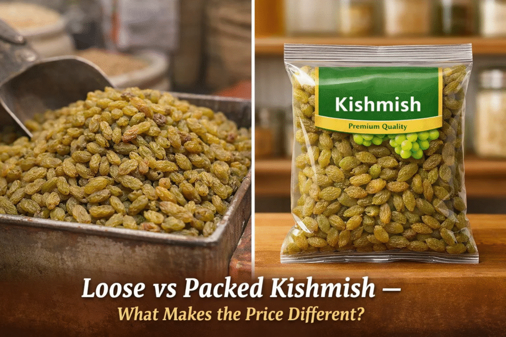 If you’ve ever bought from a local shop, you’ve probably seen loose kishmish sold at a lower price.