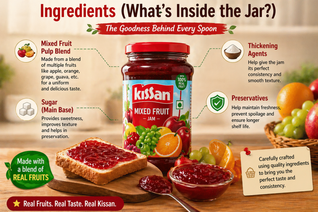 Kissan Jam is a packaged sweet spread known for its mixed fruit flavor and smooth texture. It’s commonly used on bread, roti, or even as a quick snack filler.