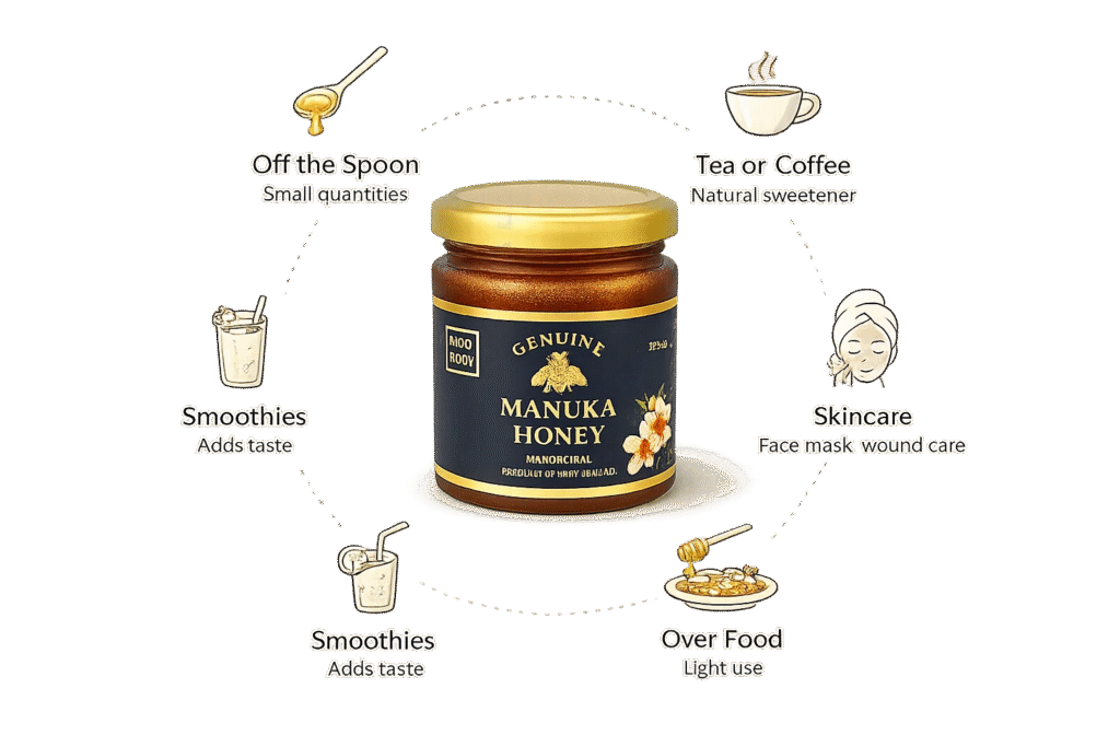 Manuka Honey is not often used on a daily basis, nor is it a substitute for honey. It is typically used with caution, in small quantities and for specific purposes.