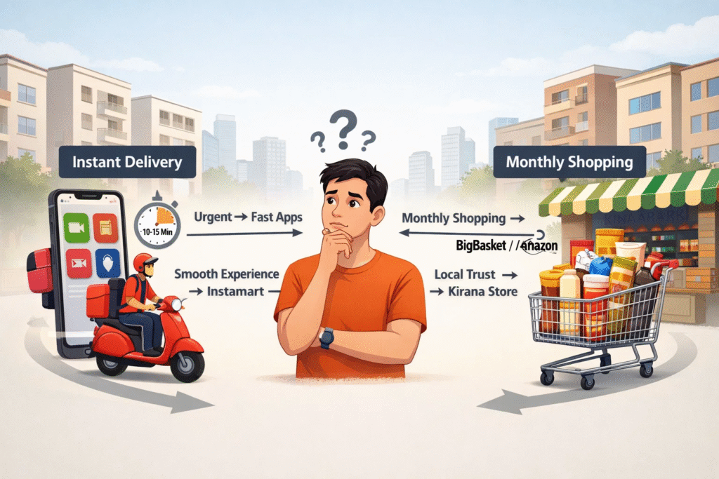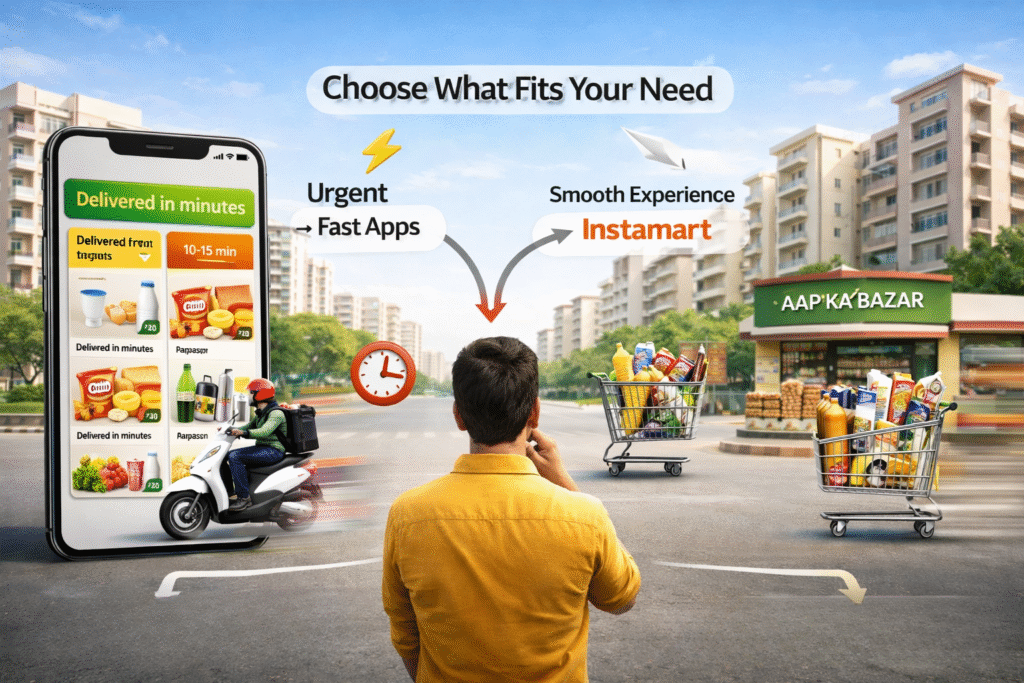 Apps give you speed and variety, while stores like Aap Ka Bazar give you reliability and a personal touch.