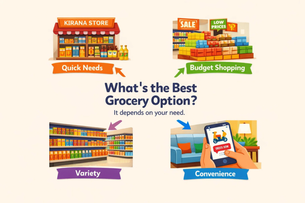 Some days you just need quick items like milk or bread, and the nearby shop saves you. And then there are those lazy days when even going downstairs feels like work… that’s when online delivery feels like the best option 😄