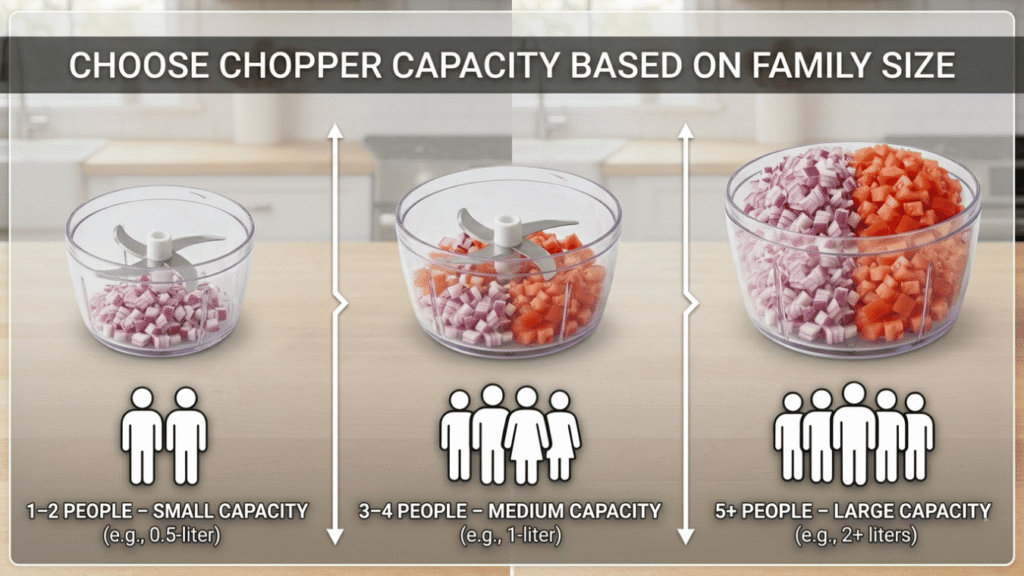 Choppers have varying capacities in the bowls. The capacity of the chopper you should choose is based on the needs of the people in the family.