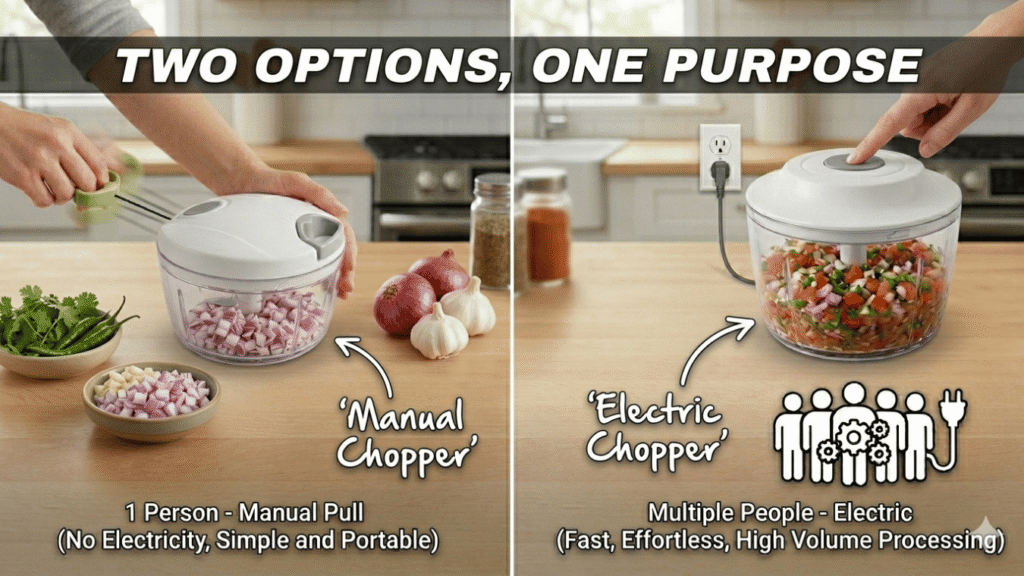 Manual and electric choppers are equally useful for Indian cooking.