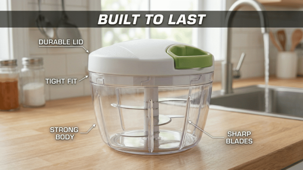 A chopper is something that one uses almost daily. Therefore, it must be durable. One must look for strong plastic materials used in the body of the chopper, strong lids, and tight-fitting parts.